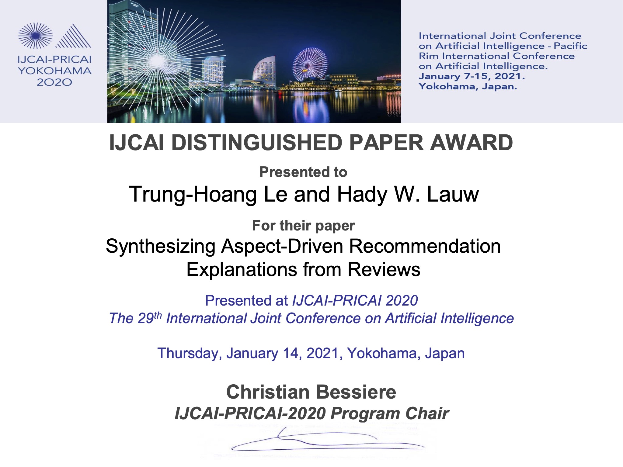 Hoang’s thesis looked into various means for deriving explanations for recommendations from textual reviews. In particular, his first work on synthesizing an explanation from multiple reviews won a Distinguished Paper Award at IJCAI-20.